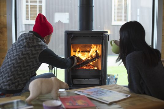 薪ストーブの前でほっとひと息、リラックスタイムをお過ごしください。 -