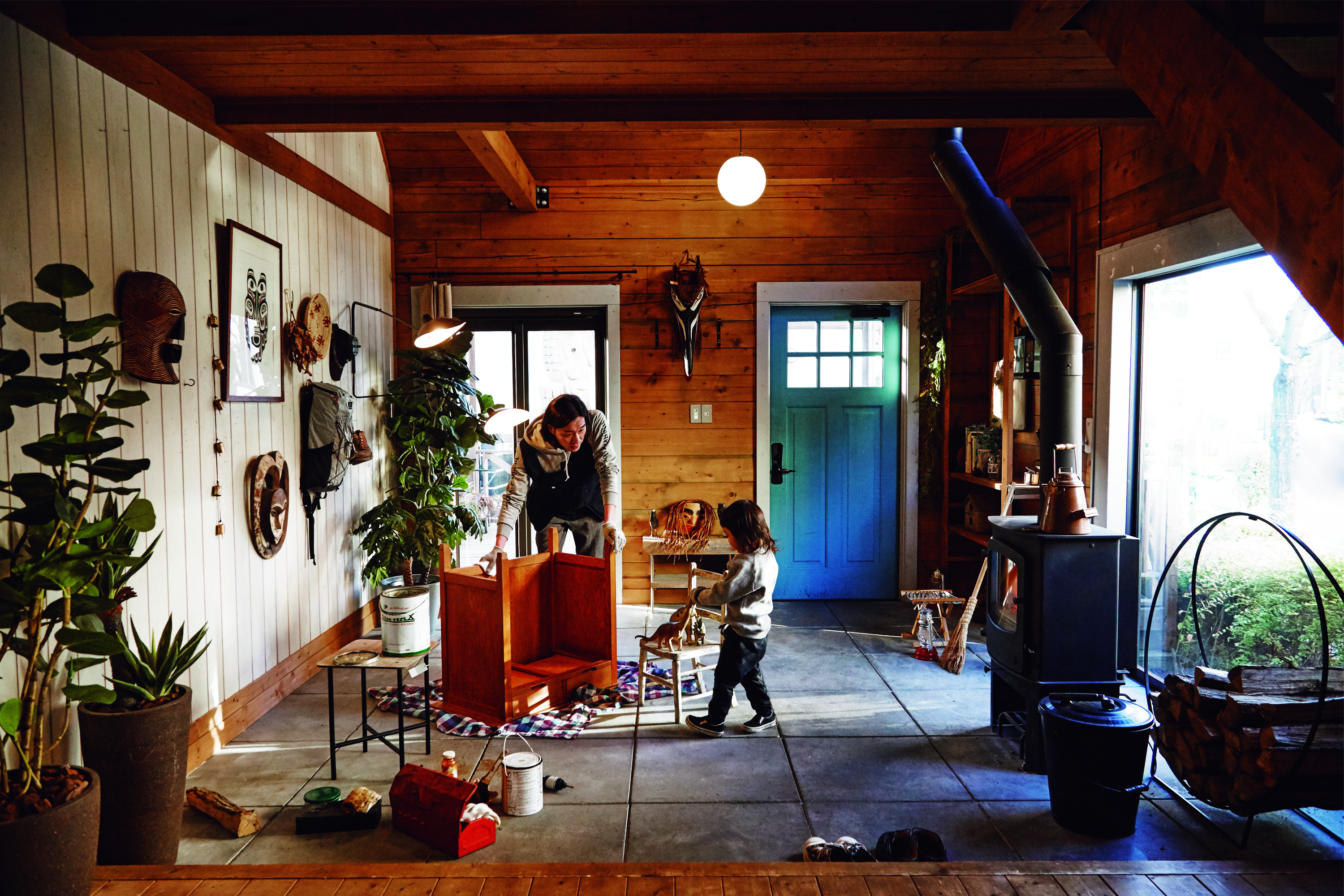 薪ストーブの炎を眺めながら、木に囲まれた空間で、